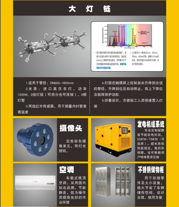 (4)依據不同管徑,紫外線UV燈架以0.5米/分鐘--1米/分鐘 的巡航速度固化,施工周期短(單段50米軟管紫外